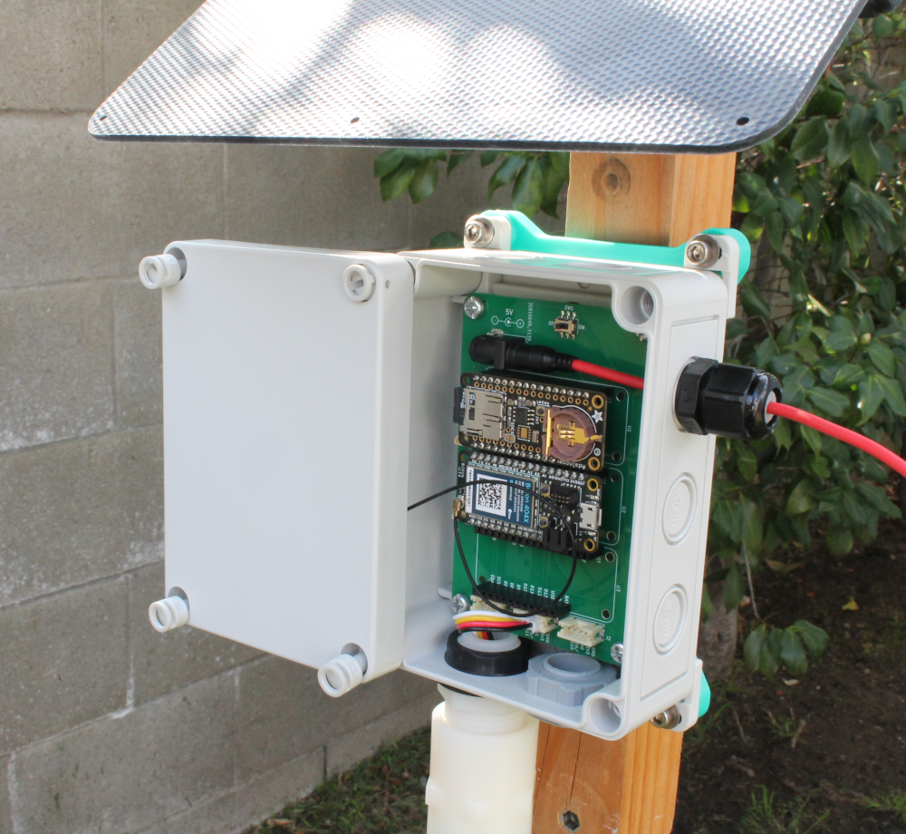 The Feather Tripler PCB is carrier-board designed for rapid prototyping of outdoor monitoring projects. The PCB works with the Adafruit Feather ecosystem of Feather microcontroller boards and FeatherWing expansion boards. As the name suggests, the Feather Tripler has 3 sets of Feather/FeatherWing headers and will work with up to three boards (1 Feather + 2 FeatherWings). The PCB is designed to fit inside a Polycase SK-15 waterproof enclosure using a spacer kit.